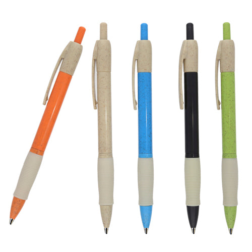 100 piezas | Bolígrafo con clip, barril y punta de paja de trigo (fibra de trigo), agarre de goma y mecanismo de clic , con logo impreso