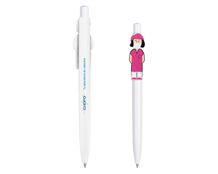 50 piezas | Bolígrafo plástico con figura de doctora en el clip. Mecanismo de click, con logo impreso.